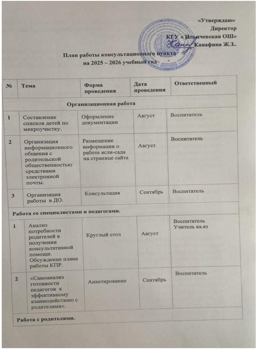 | 1 | «Ваши ожидания от работы консультативного пункта». | Анкетирование | Сентябрь | Воспитатель | |||